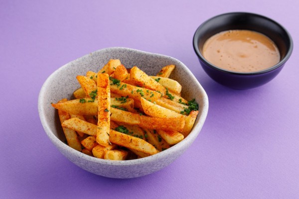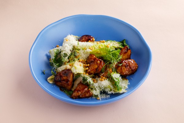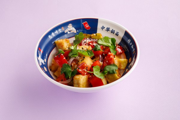 Салат с хрустящими баклажанами, томатами и соусом свит чили